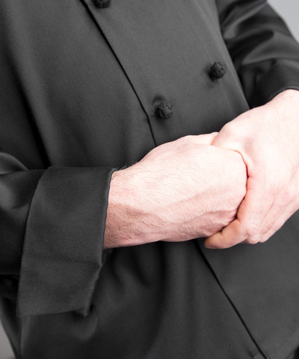 Add continental appeal to your cooking attire with French knot buttons, a stand-up collar, and a classic double-breasted front.