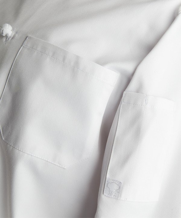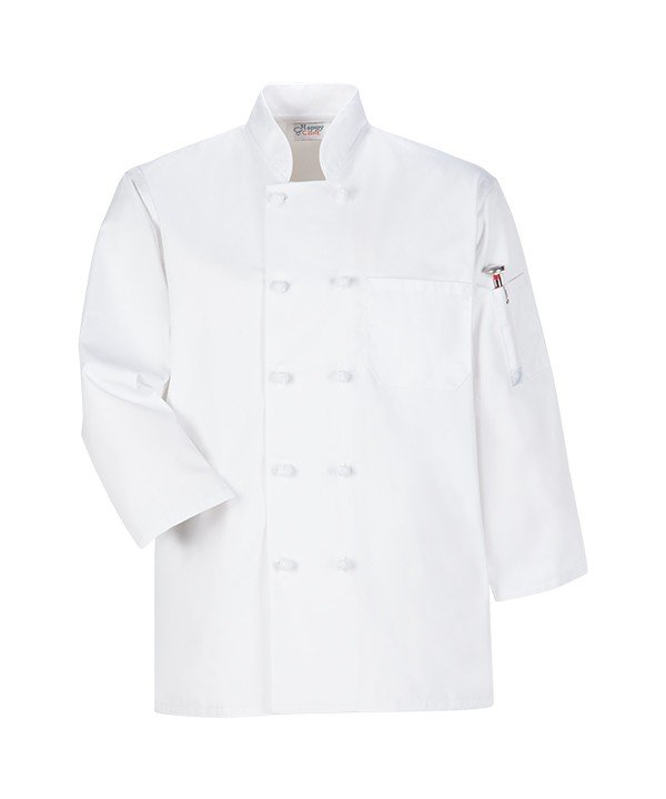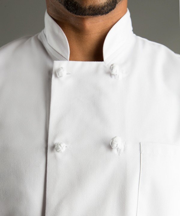 Add continental appeal to your cooking attire with French knot buttons, a stand-up collar, and a classic double-breasted front.