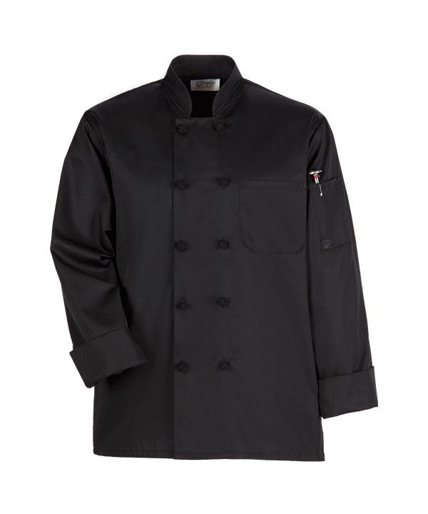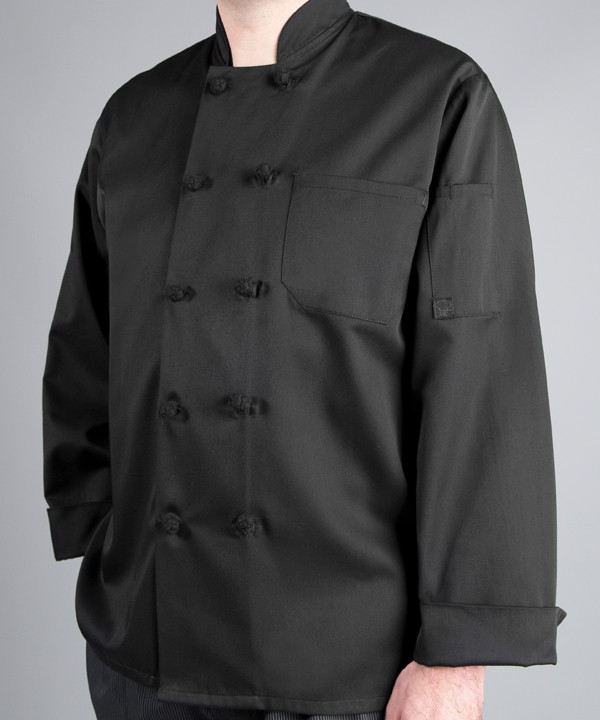 Add continental appeal to your cooking attire with French knot buttons, a stand-up collar, and a classic double-breasted front.